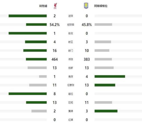 没有放弃的维拉,第70分钟形成反击,但马伦的打门稍稍偏出,没有能够命中目标,余下的时间,利物浦明显开始控制节奏,虽然没能够进一步扩大领先,但防守端也没有给维拉任何机会,如愿零封获胜。